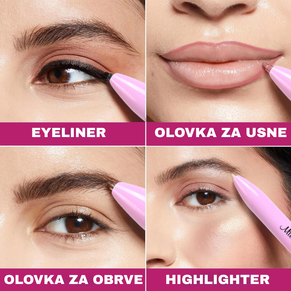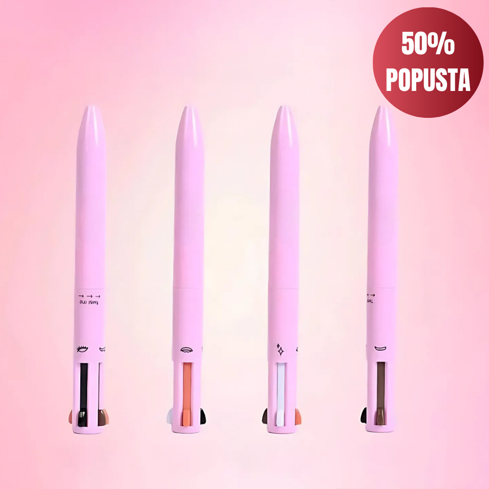Olovka sadrži četiri različite boje u jednom praktičnom pakovanju — crnu za eyeliner, braon za obrve, belu za highlighter i rozu za konturisanje usana. Pritiskom na dugme birate boju koju želite da koristite, a zatim je okrećete kako biste izbacili potrebnu količinu.