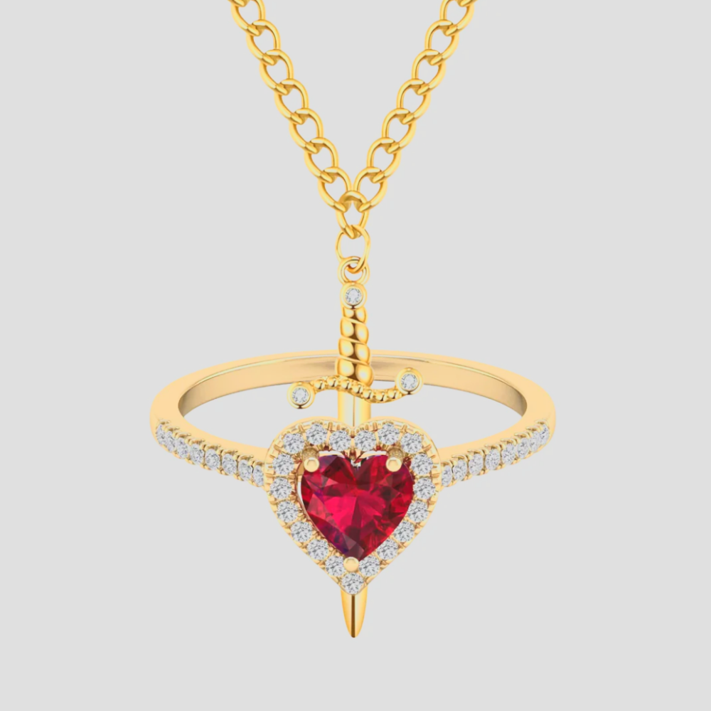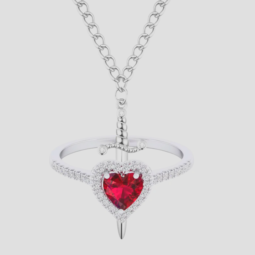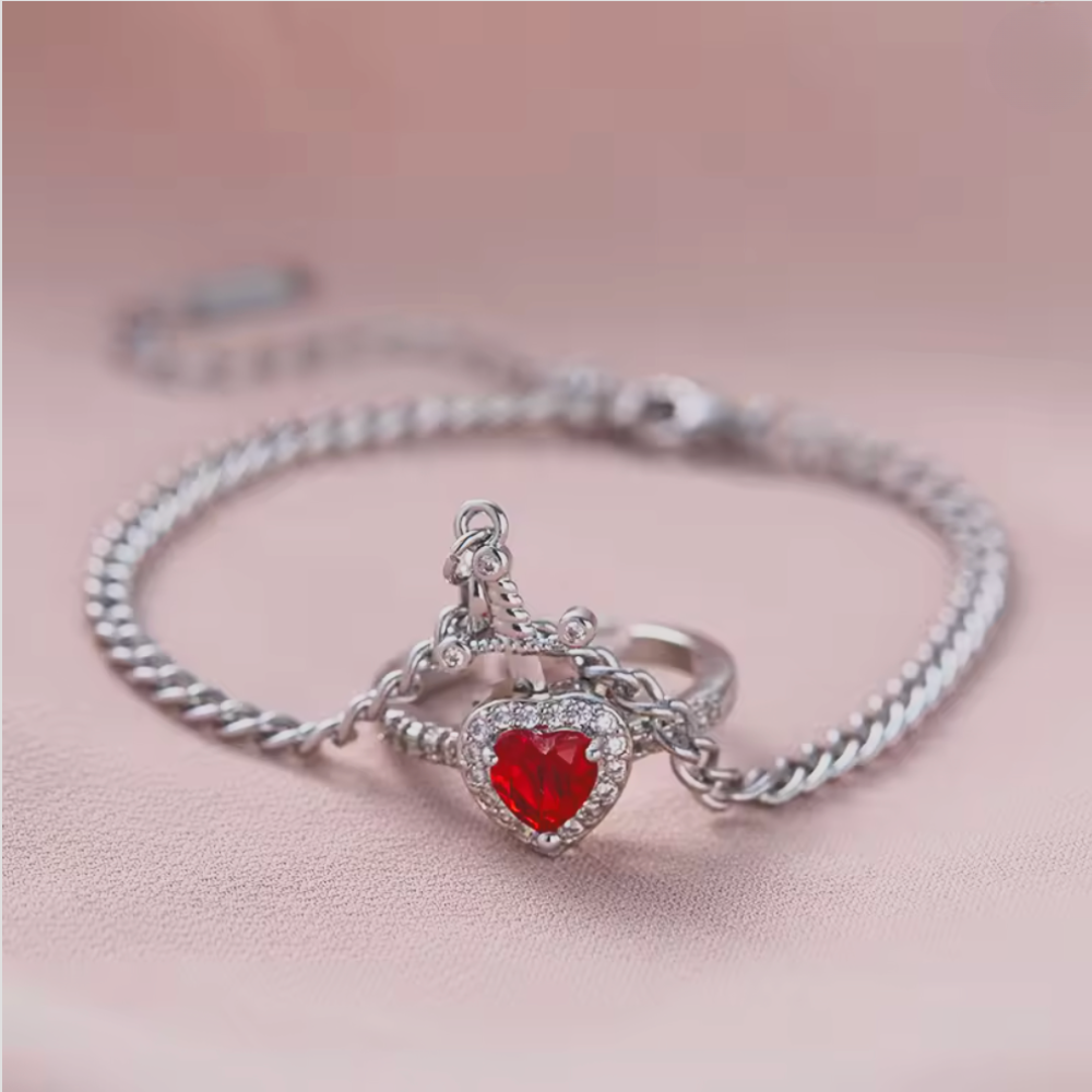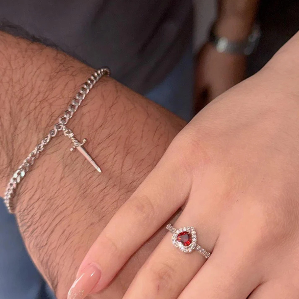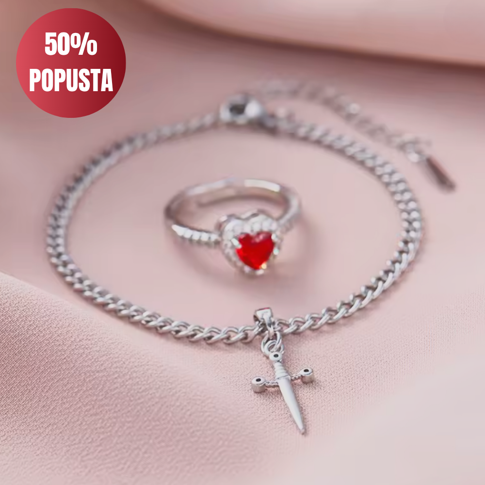 Ova narukvica nosi sa sobom više od pukog modnog detalja — ona nosi poruku. Privezak u obliku mača ne simbolizira borbu, već odanost, zaštitu i spremnost da čuvaš ono što ti je važno. U spoju s prstenom koji nosi crveno srce, ovaj set postaje mali savez između dvoje — simbol veze koja ima i snagu i nježnost.