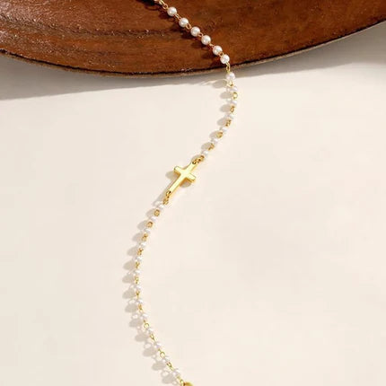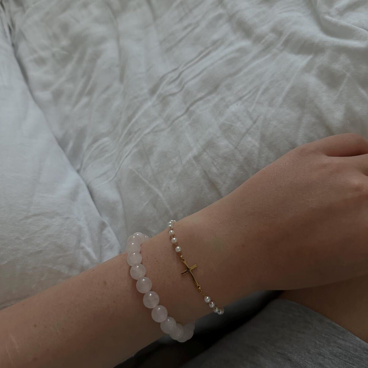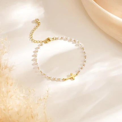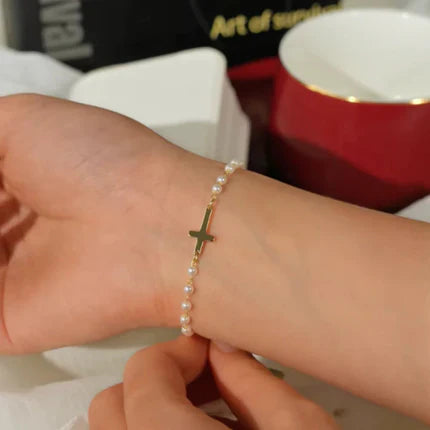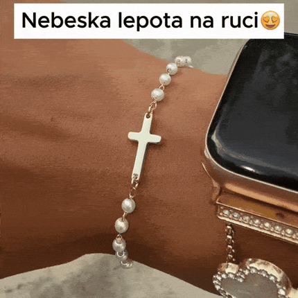 Na dodir mekani biseri i lagana forma narukvice stvaraju osjećaj topline i bliskosti. Njena suptilnost ne vapi za pažnjom, već je osvoji lako – pogledom, gestom, svjetlom koje se prelama na zlatnom krstu. To je nakit koji ne pokušava da impresionira, već da ostane kao simbol nečeg ličnog, tihog i trajnog.