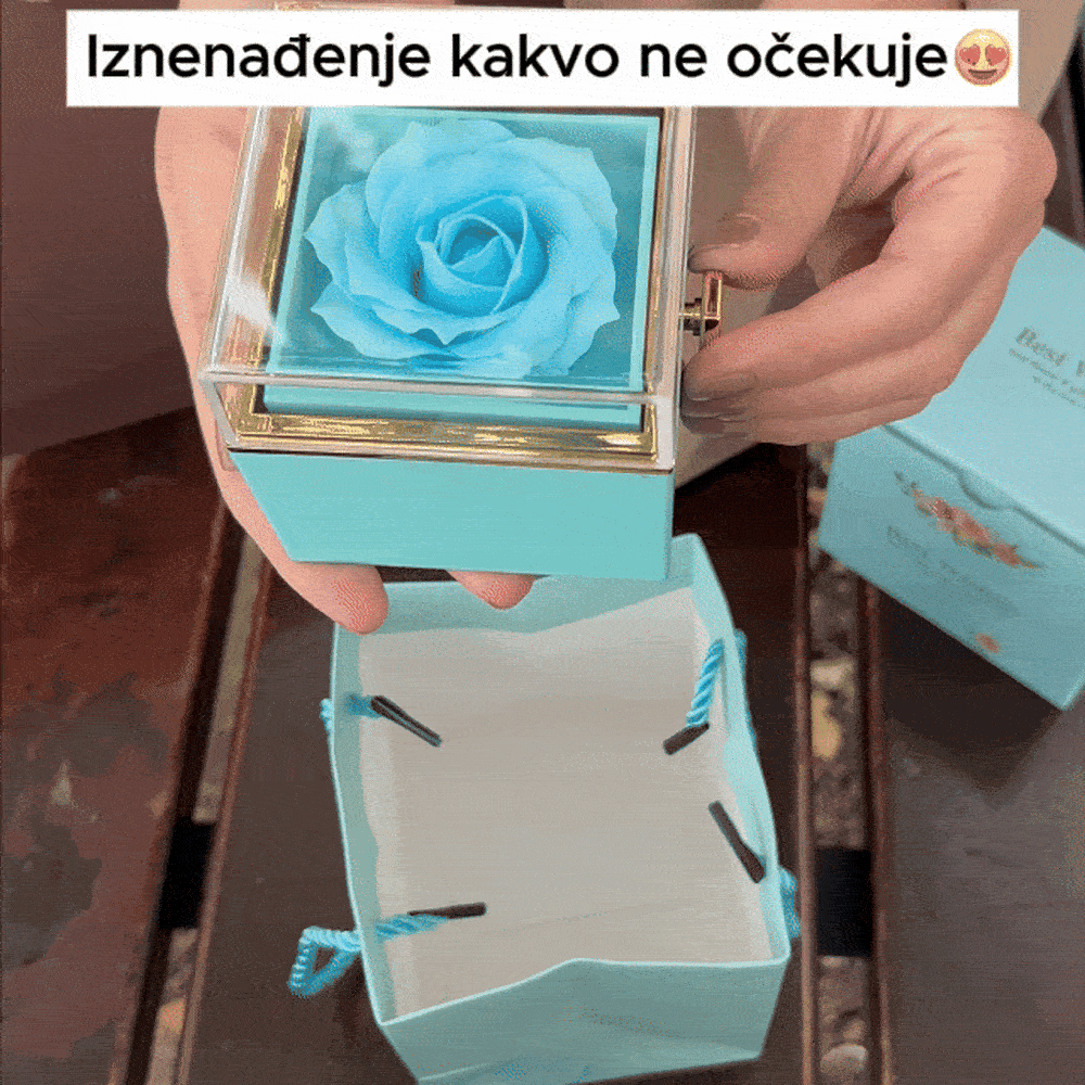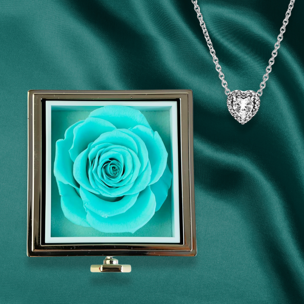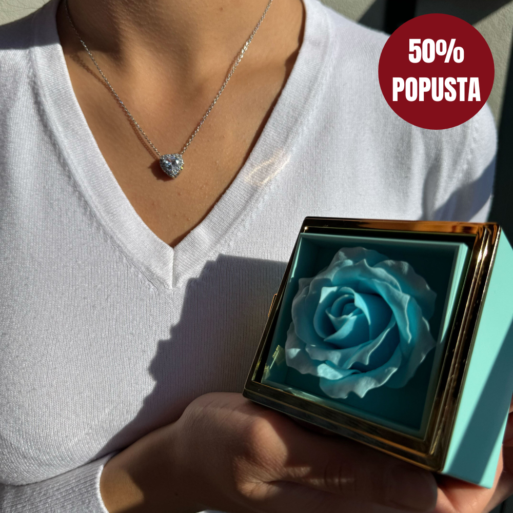 U raskošnoj kutiji boje plave ruže krije se nježno iznenađenje — ogrlica u obliku srca, spremna da očara onog ko je primi. Rotiranjem bočne ručke otkriva se tajna ovog elegantnog poklona, spajajući simboliku ljubavi i pažnje u jednom pokretu.
