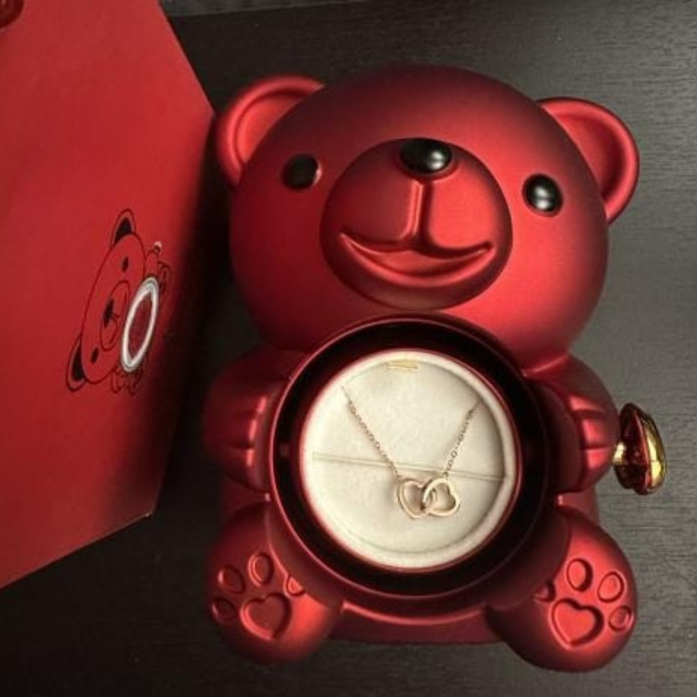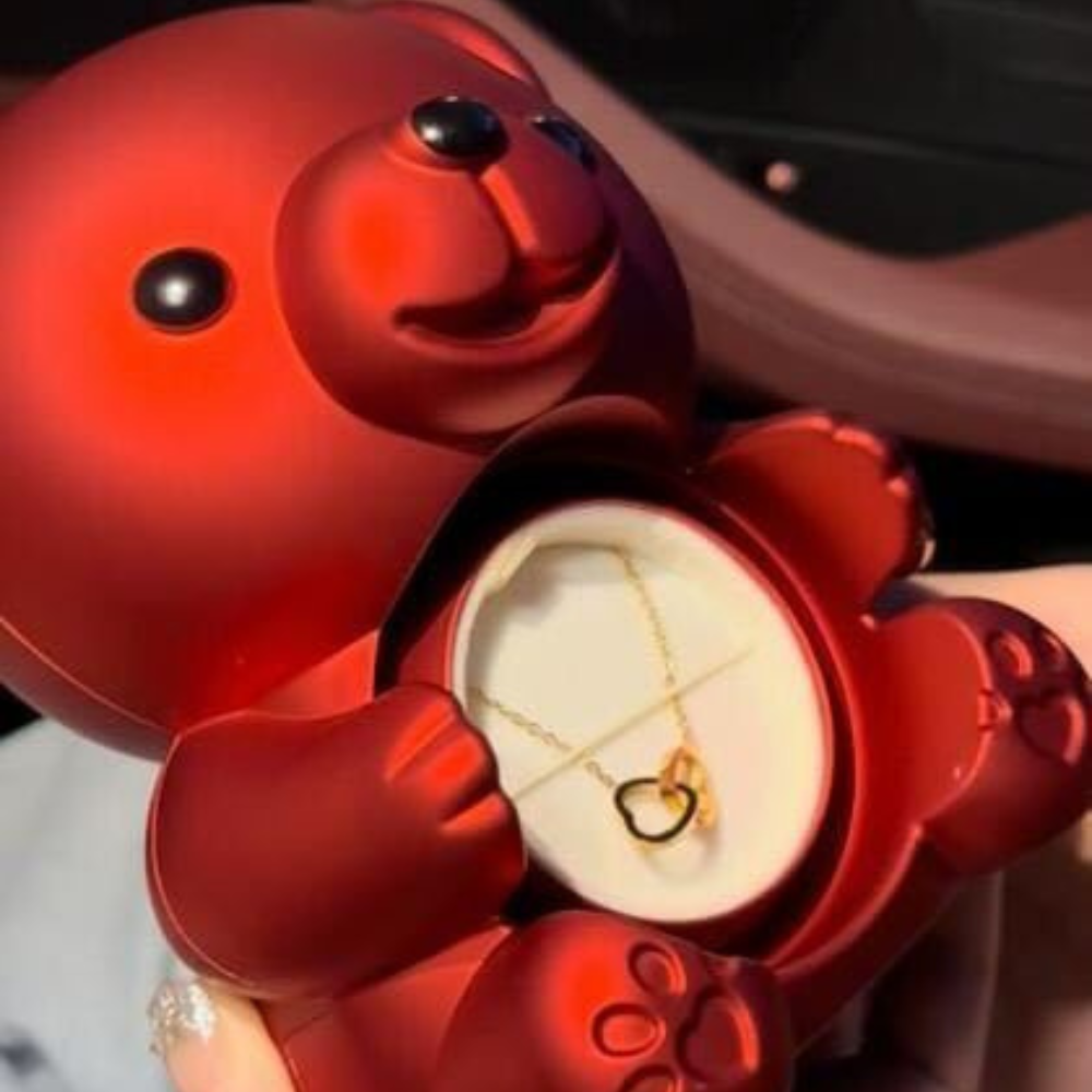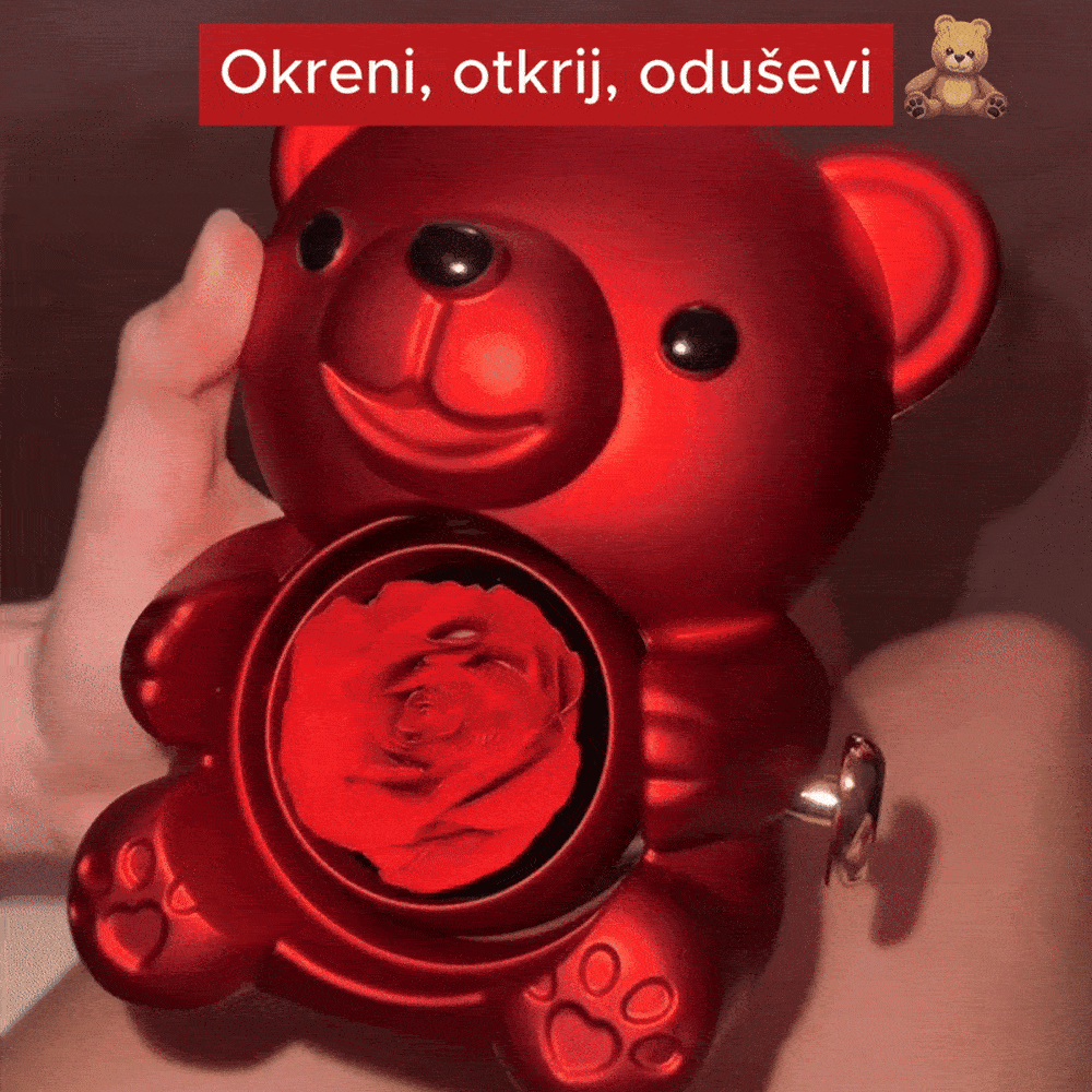 Ovaj nježni crveni medvjedić u svom stomaku krije posebno iznenađenje. Pomoću bočne ručkice, sadržaj se rotira — u jednom trenutku pojavljuje se raskošna ruža, a već u sljedećem, elegantna ogrlica. Ova neobična kombinacija simbolizira ljubav i pažnju spojene u jednom poklonu, ostavljajući snažan dojam.