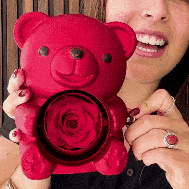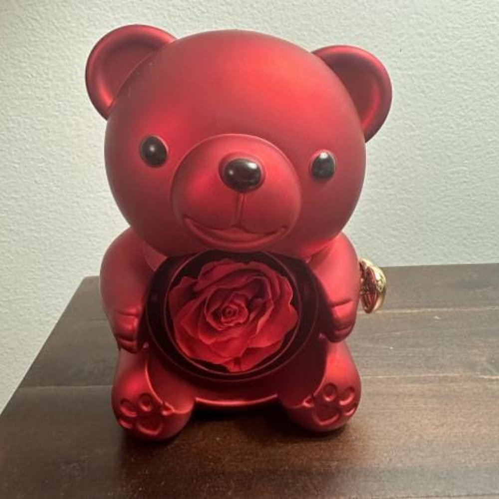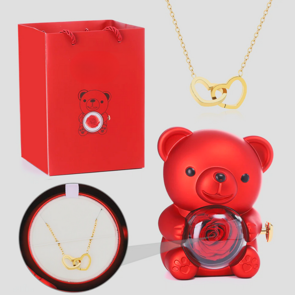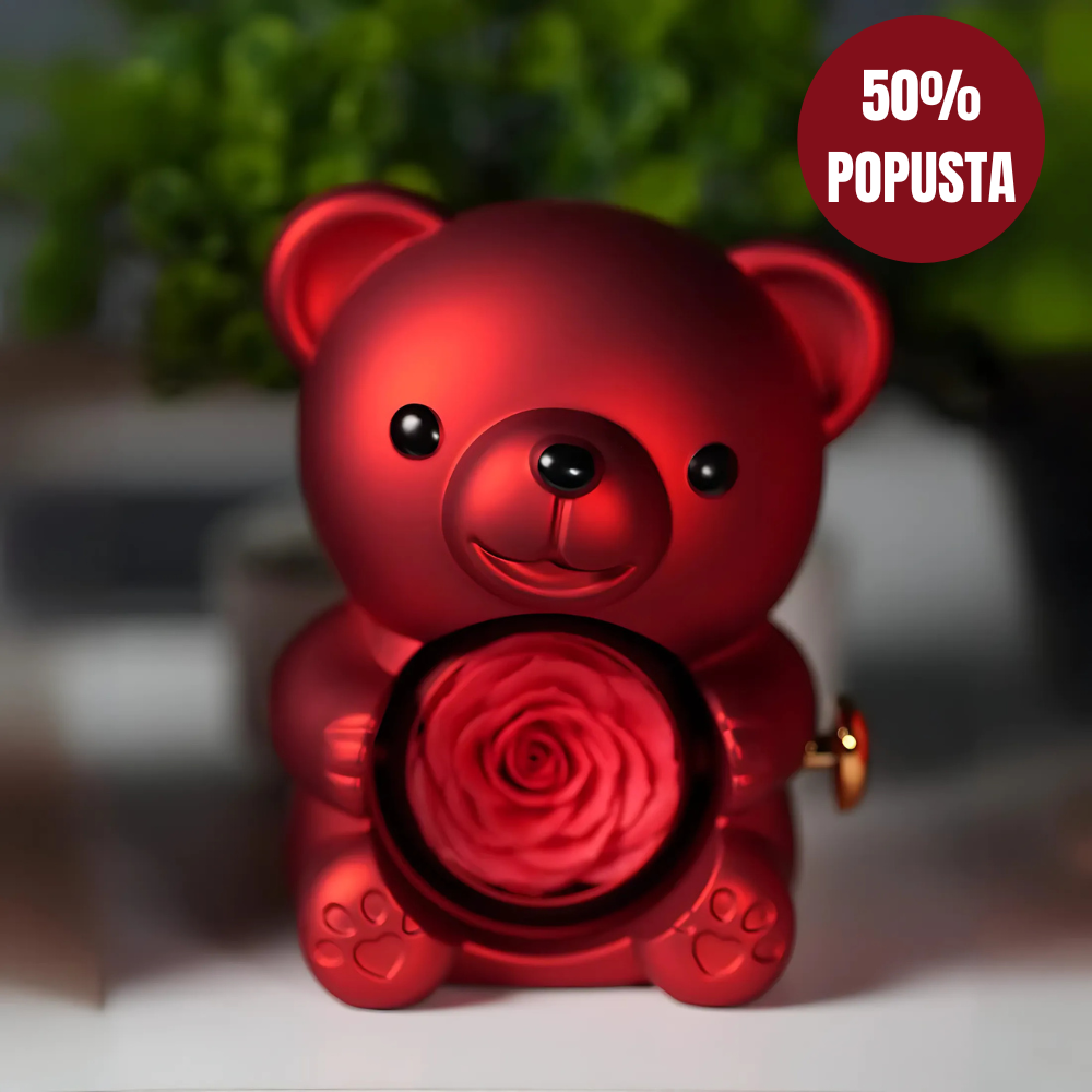 Ovaj nježni crveni medvjedić u svom stomaku krije posebno iznenađenje. Pomoću bočne ručkice, sadržaj se rotira — u jednom trenutku pojavljuje se raskošna ruža, a već u sljedećem, elegantna ogrlica. Ova neobična kombinacija simbolizira ljubav i pažnju spojene u jednom poklonu, ostavljajući snažan dojam.